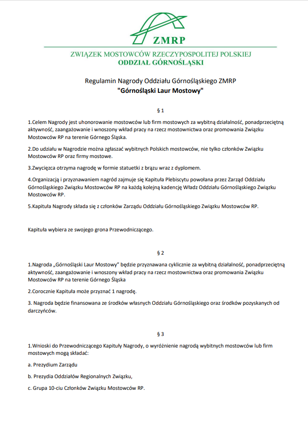 Zgłoszenia kandydatów do VIII edycji Nagrody Górnośląski Laur Mostowy można przesyłać na adres sekretarza Kapituły: sekretarz@zmrpkatowice.pl w terminie do 31.03.2024 r.