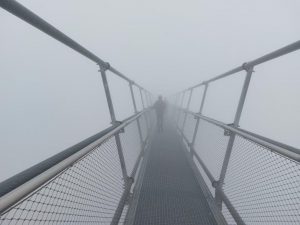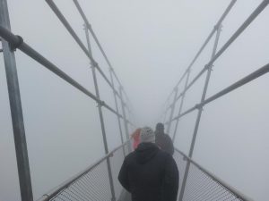 Przejście po podatnym na wiatr pomoście wymagało odrobiny odwagi, ale rekompensowane to było niezwykłymi wrażeniami. A wiatr wcale nie był słaby. Poza tym, po dotarciu na miejsce okazało się, że aura sprawiła nam sporego psikusa. Cała kładka została bowiem spowita gęstą, białą mgłą. Niezrażeni tą sytuacją ruszyliśmy jednak w nieznane. I to naprawdę w nieznane, bo widoczność ograniczona była do zaledwie 20 m. Idąc po pomoście można było odnieść wrażenie, że zmierzamy w otchłań mgły, wcale nie będąc pewnymi, co nas czeka po drugiej stronie. Dużym plusem tej nieprzewidzianej sytuacji był fakt, że udało nam się zrobić wiele magicznych i niepowtarzalnych zdjęć kładki spowitej gęstą mgłą. Wizytę w Czechach zakończyliśmy w miejscowości Jesionik degustując różne specjały kuchni naszych południowych sąsiadów.